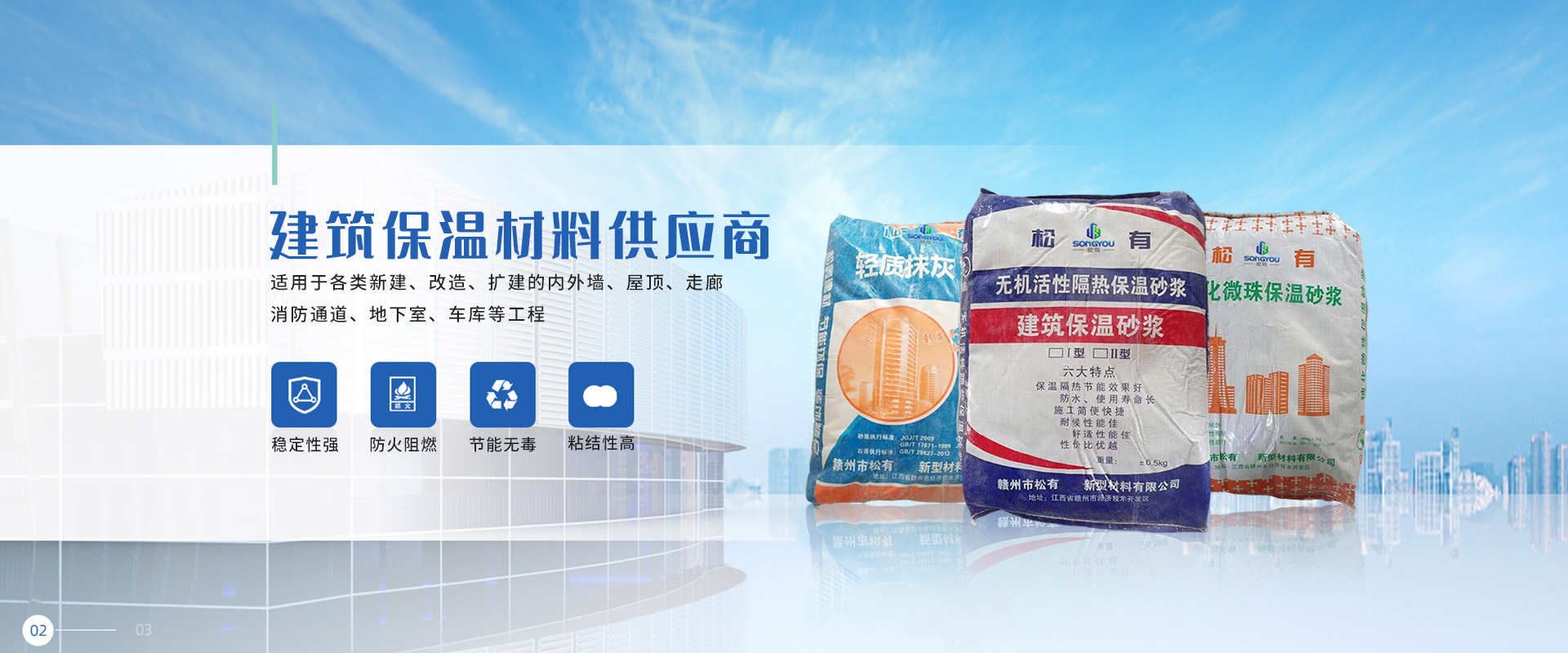 江西松有新型材料有限公司,主要從事保溫材料、防水材料銷售,兼營建筑材料、裝飾材料和金屬材料等銷售,主要產品有巖晶砂、高分子益膠泥、輕質抹灰砂漿石膏、防滲抗裂砂漿、玻化微珠保溫砂漿、砌塊砌筑粘接劑、無機活性隔熱保溫砂漿、加氣磚專用砌筑砂漿等。